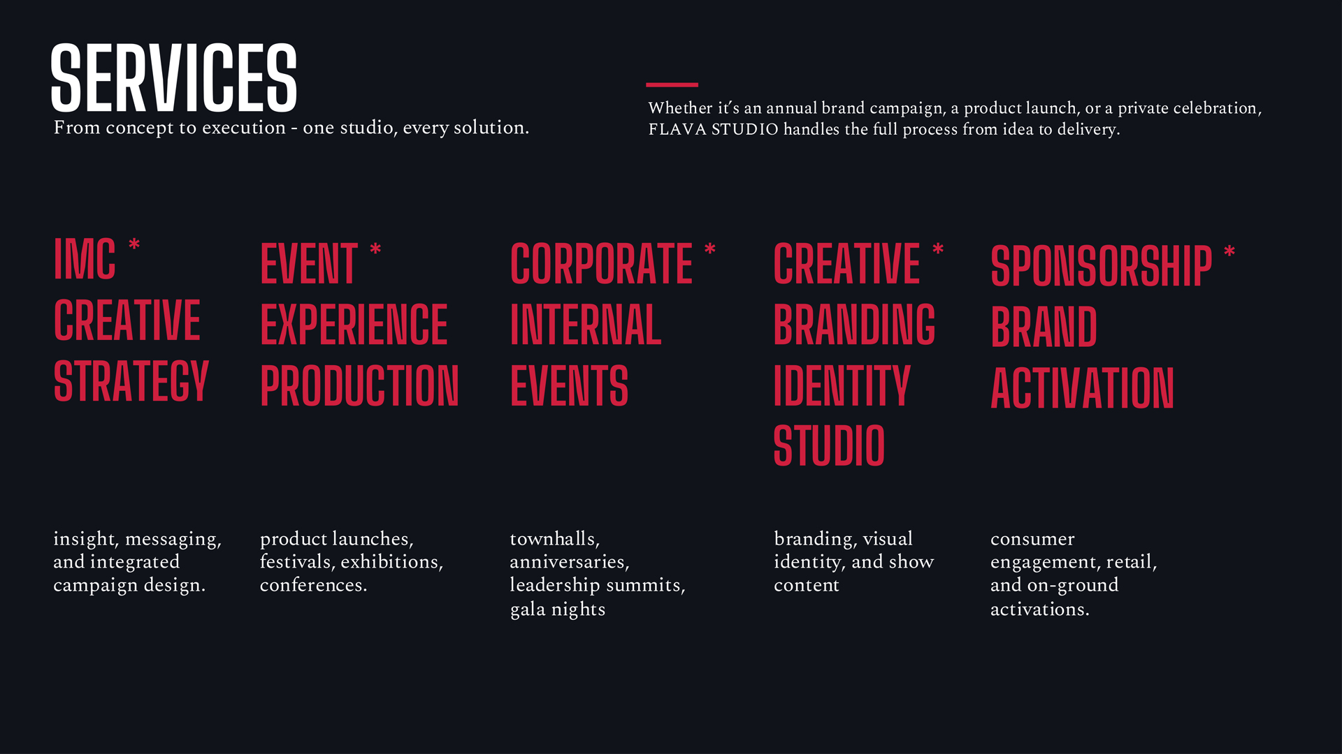 Flava Live Develops And Operates Experiential Platforms, Cultural Productions, And Creative Brand Services. From Youth Playgrounds To Theatre Stages, From Mass Festivals To Brand Campaigns - We Make Experiences That Move People And Deliver Impact.